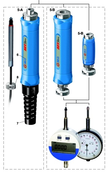 Ha una caratteristica forma ergonomia e consente la manovrabilità del tampone. Può essere di tipo porta-sonda (per le applicazioni elettromeccaniche – fig. 5-A) oppure portacomparatore (per orologi meccanici o digitali – fig. 5-B). Quest’ultimo è disponibile in due versioni (piccola e grande).
