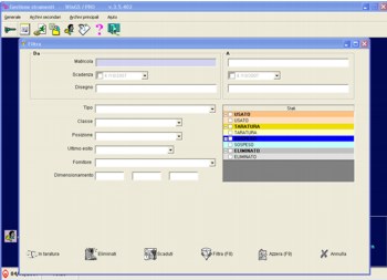 - Catalogazione dello strumento con tutte le informazioni tipiche quali: matricola, disegno, tipo, dimensione, classificazione, posizione, intervallo di taratura, più 8 campi definibili dall’utente.